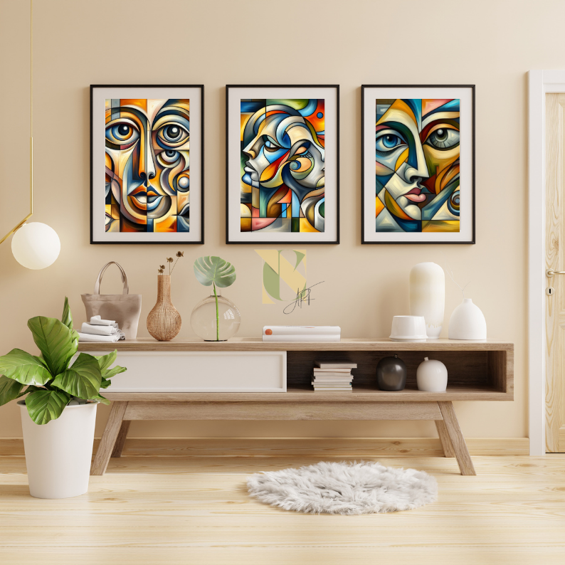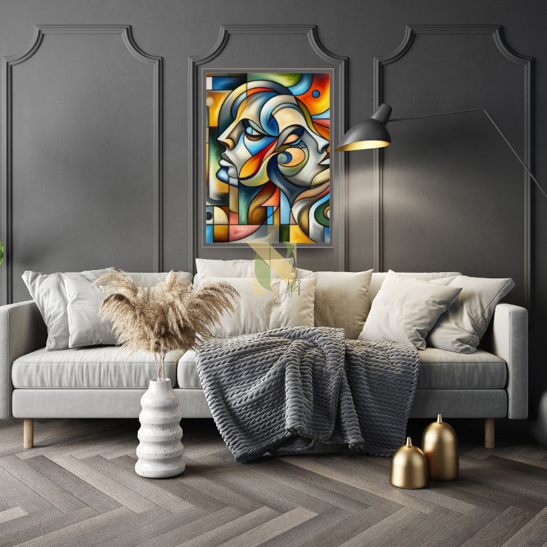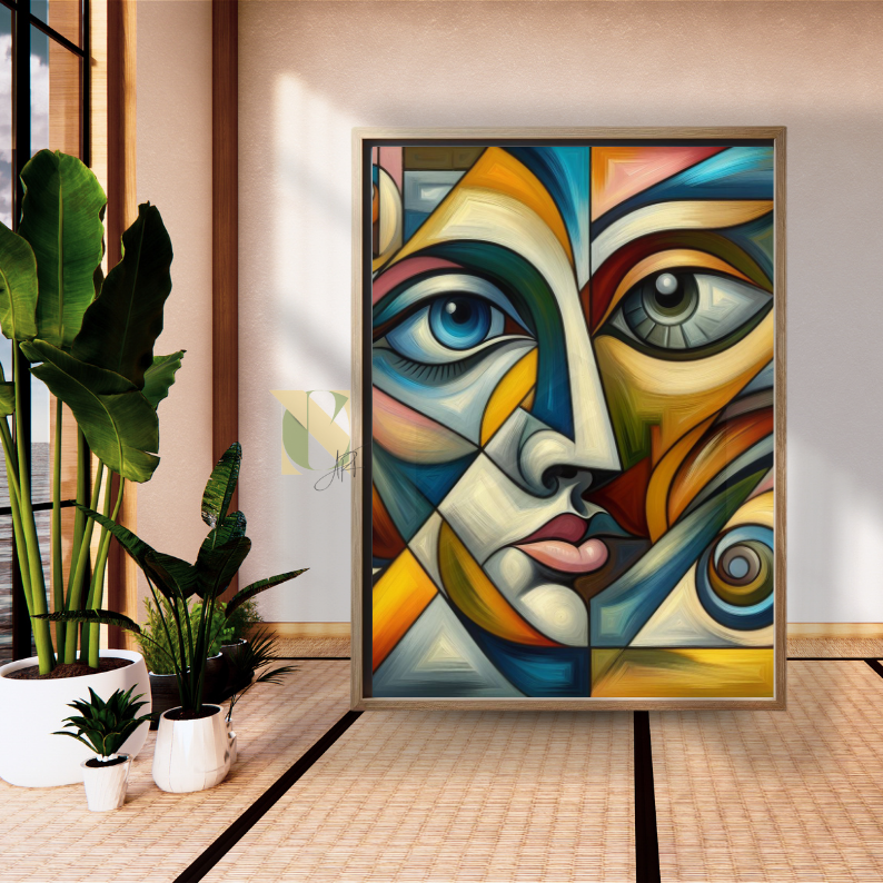 Add some color and personality to your space with this stunning digital artwork that captures the essence of the human soul. This artwork is created with the help of AI, using geometric shapes and various shades to depict different emotions and characters. Each piece is unique, original, and authentic.